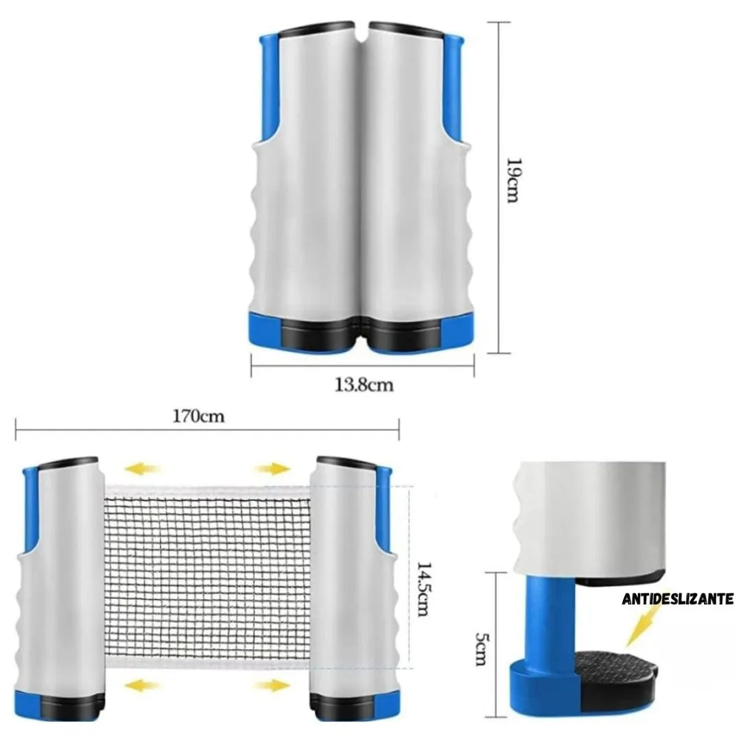 Incluye: 1 red retráctil, 2 raquetas, 3 pelotas.